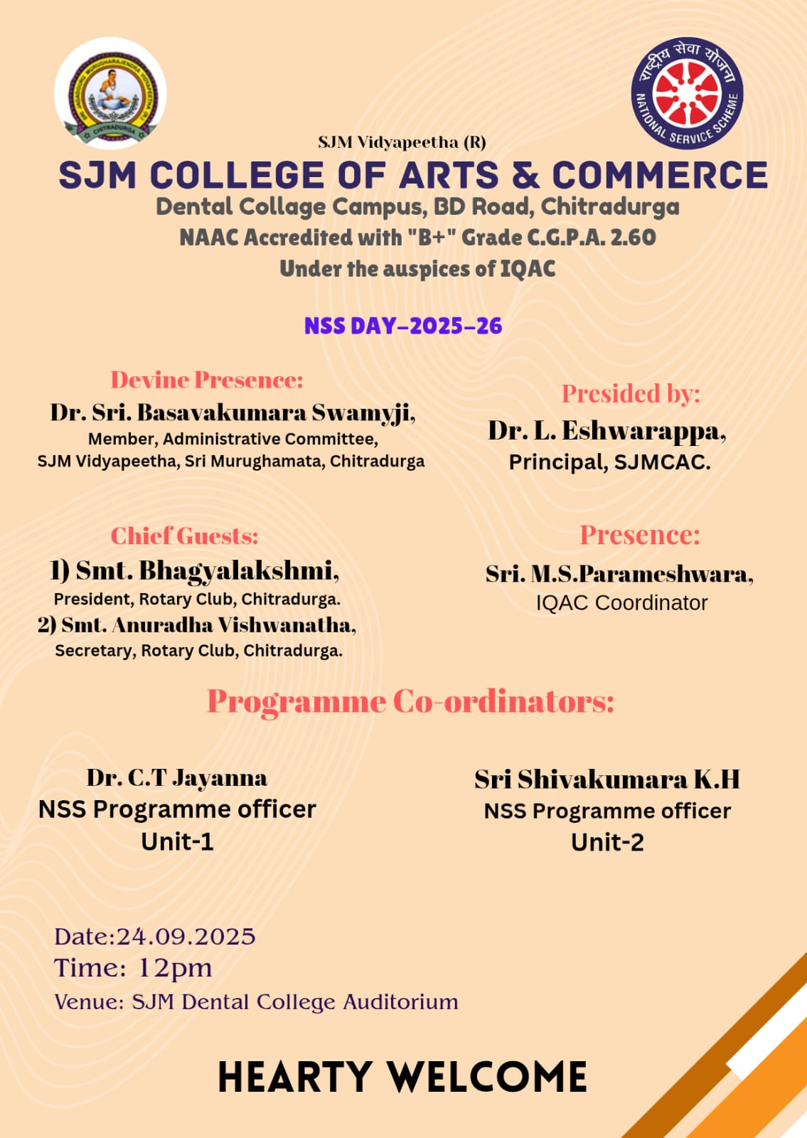 N.S.S in our college was started during the year 1998 and several officers have rendered their service and brought reputation to our college. Presently, we have 2 units under the guidance and supervision of our N.S.S Programme Officers Sri G.S. Nagaraja (Unit 1) and Sri Maqsood Ahamed (Unit 2)