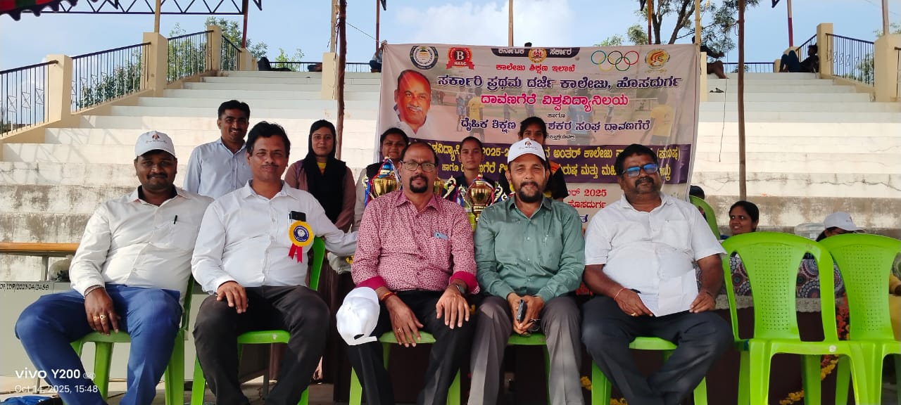 College has indoor games facilities like; Table Tennis, Chess, Carrom and outdoor games like; Volleyball, Kho-kho, Throwball, Kabbaddi, Hand ball and Taekwondo. For outdoor and athletic games, college has made a MoU with District Youth Services & Sports, Chitradurga. Physical Education Director conducts sports coaching to students. College has provided sufficient sports and gymnasium facility in sports room. Inaddition, Physical Education Director gives training to students for their participation on the occasion of International Yoga day. Yoga training has been arranged for students and staff. College has invited women Yoga expert outside the campus to train our students in performing yoga. During the assessment period, college has organized 5 times inter collegiate sports competitions. In these competitions few of our students have bagged Gold, Silver and Bronze medals in various sports and games activities.